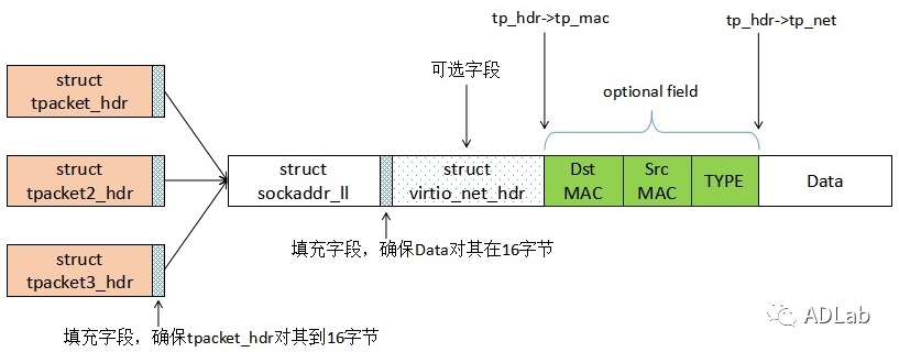 ͨ¹ýsetsockopt()º¯ÊýÉèÖû·Ðλº³åÇø£¬option²ÎÊýÉèÖÃΪPACKET_RX_RING»òPACKET_TX_RING¡£ÎªÁËÀû±ãÄÚºËÓëÓû§²ã¹ÜÀíºÍ½»»¥»·Ðλº³åÇøÖеÄÊý¾ÝÖ¡£¬Äں˽ç˵ÁËTPACKET_HEADER½á¹¹Ì壬¸Ã½á¹¹Ìå´æ´¢×ÅһЩԪÐÅÏ¢ÈçÌ×½Ó×ÖµØÖ·ÐÅÏ¢¡¢Ê±¼ä´ÁÒÔ¼°»·Ðλº³åÇø¹ÜÀíÐÅÏ¢µÈ¡£ÈôÊÇͨ¹ýsetsockopt()º¯ÊýÉèÖÃÁËPACKET_VNET_HDRÑ¡Ï»¹ÐèÌí¼ÓÒ»¸övirtio_net_hdr½á¹¹Ìå¡£Ò»¸öÊý¾ÝÖ¡°üÀ¨Á½¸ö²¿·Ö£¬µÚÒ»²¿·ÖΪTPACKET_HEADER£¬µÚ¶þ²¿·ÖΪData£¬²¢ÇÒÒª°ü¹ÜÒ³ÃæÁÙÆë£¬ÈçÏÂͼËùʾ£º