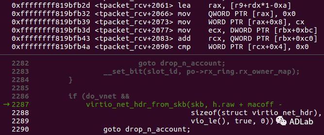 rdxÖдæ·Å×ÅTPACKET_ALIGN(tp_hdrlen+(maclen < 16 ? 16 : maclen))£¬¾ÞϸΪ0x50¡£rbp+0x4e4´¦´æ·Å×Åpo->tp_reserve£¬¾ÞϸΪ0x0000ffb4¡£Ïà¼Óºó£¬ÕûÊýÉÏÒçºó£¬rdxΪ0x0004¡£µ±Ö´Ðе½Ô½½ç»á¼ûʱ£¬ÏêϸÈçÏ£º